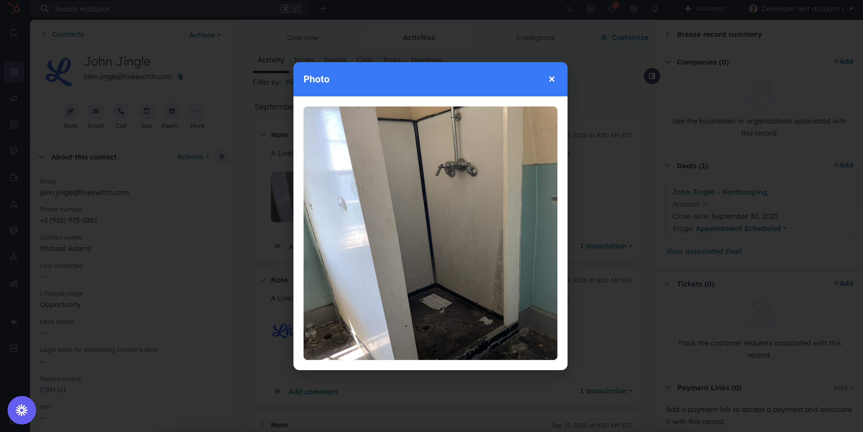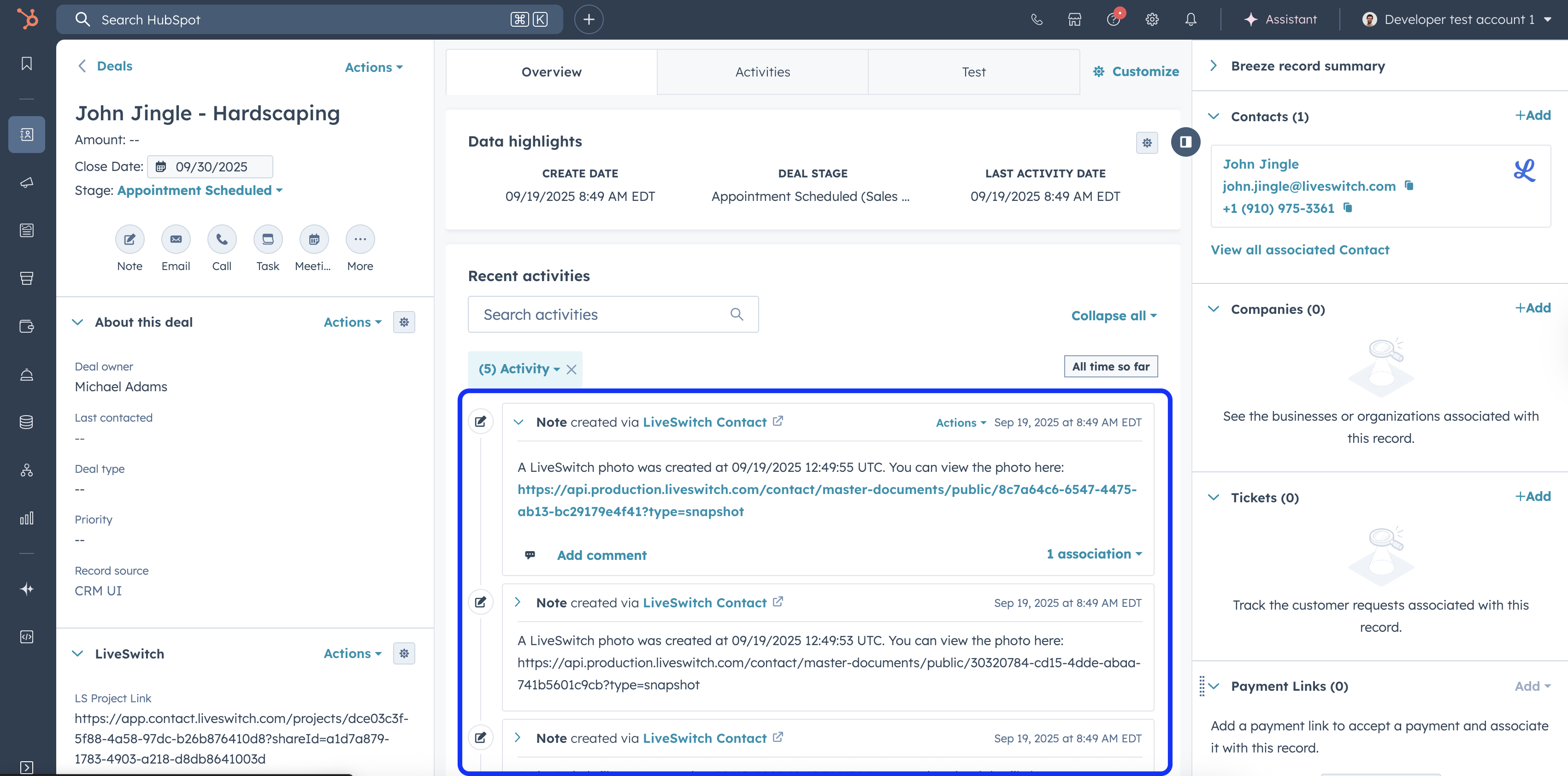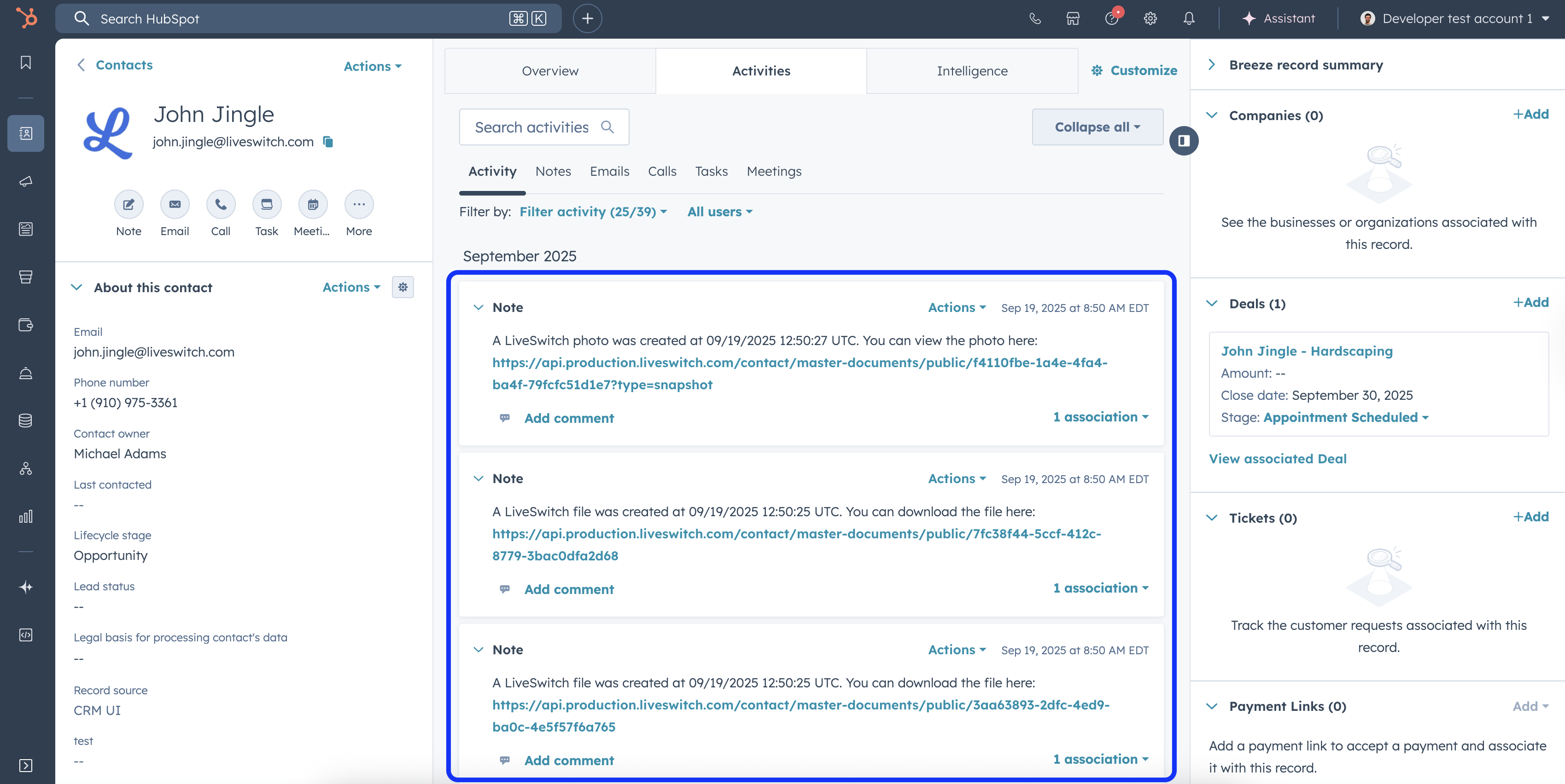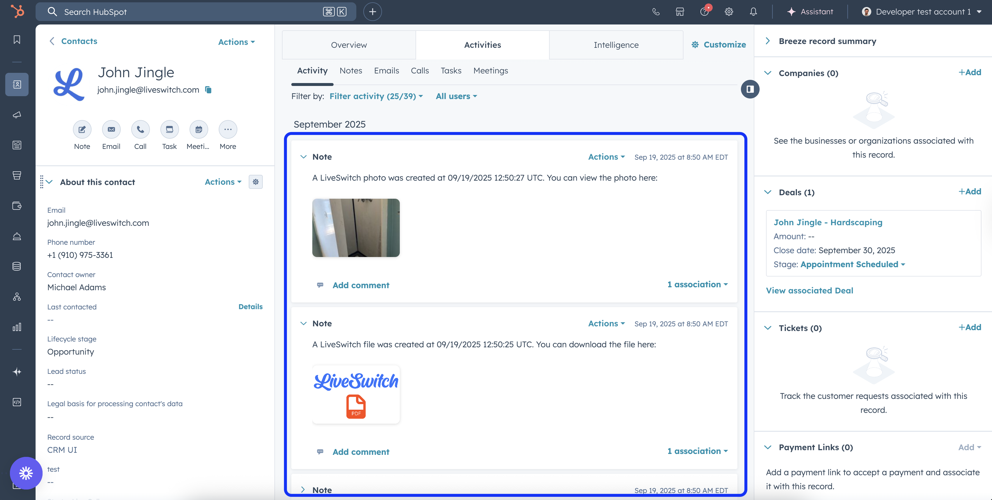 When you create a photo, video recording or file in LiveSwitch, the app will add a note with a link to the corresponding contact or deal record in HubSpot.